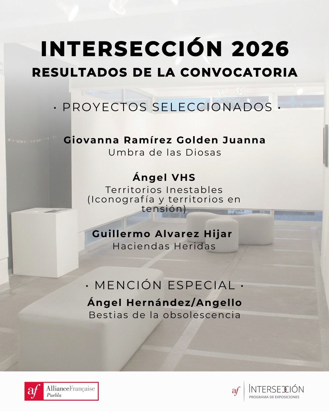 Intersección: cada año abrimos una convocatoria abierta a la creación visual poblana. Seleccionamos 3 proyectos que se exhiben en nuestra galería a lo largo del año.